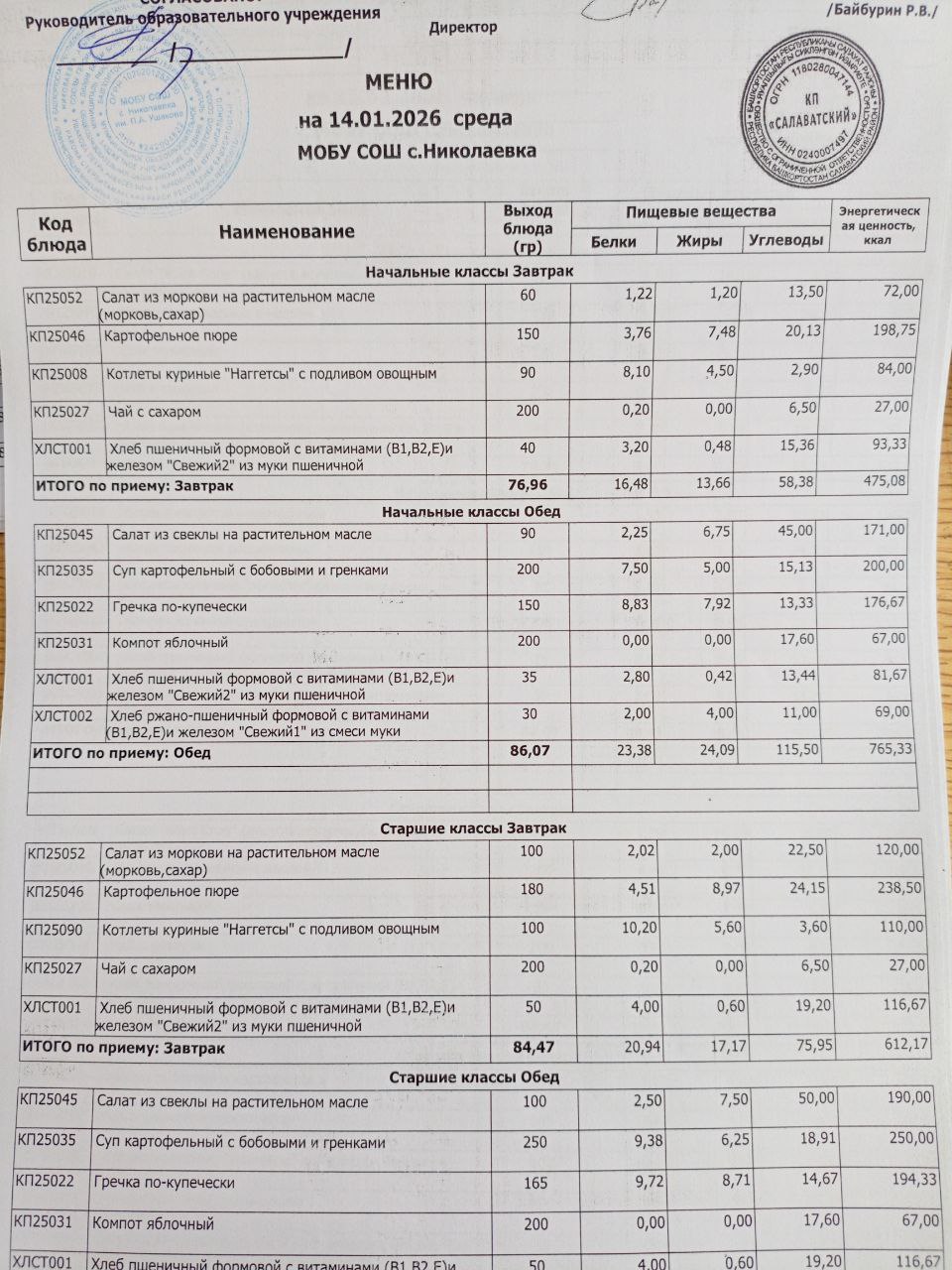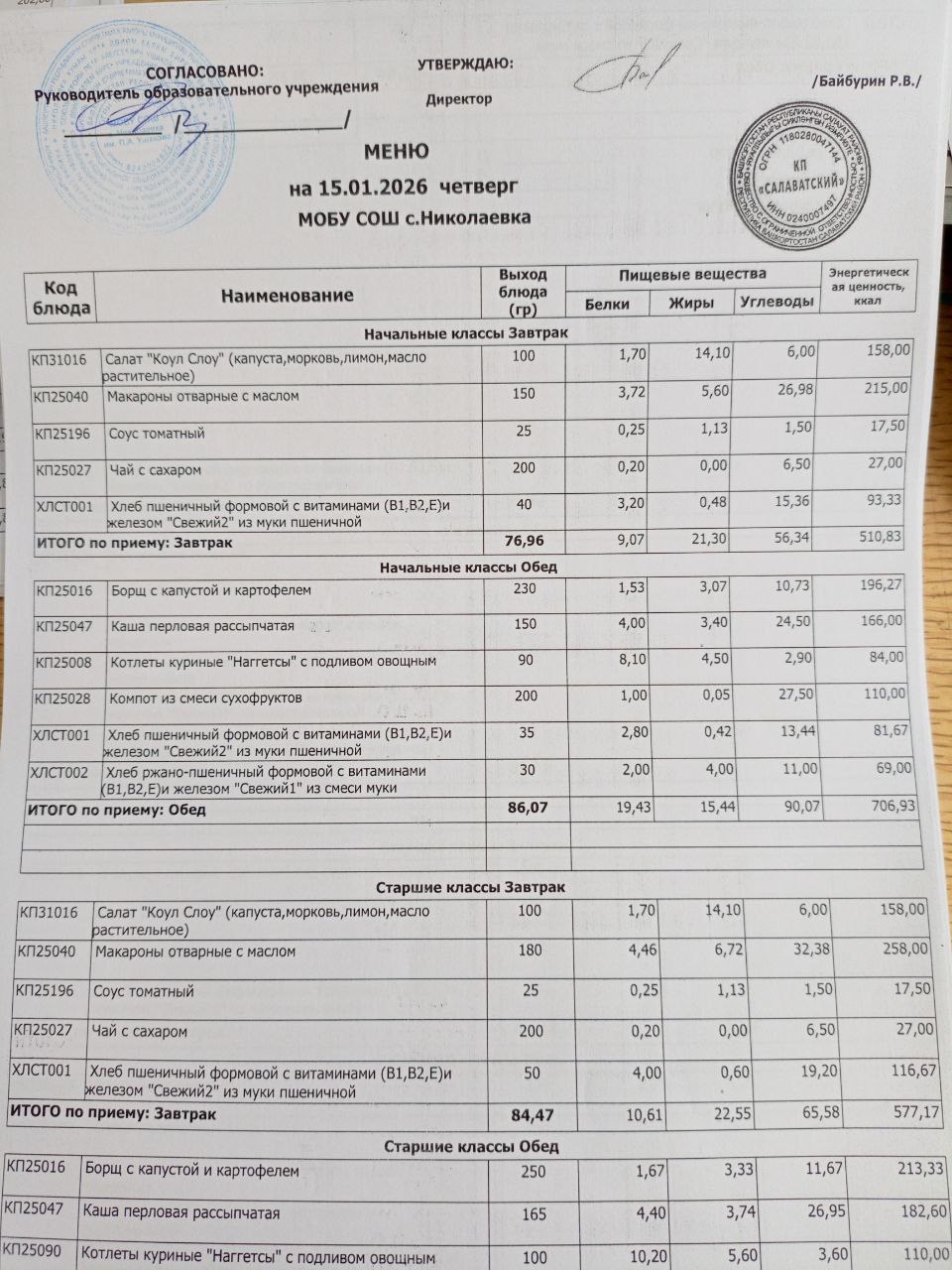 Ежедневное меню дошкольной группы филиал д.Преображеновка