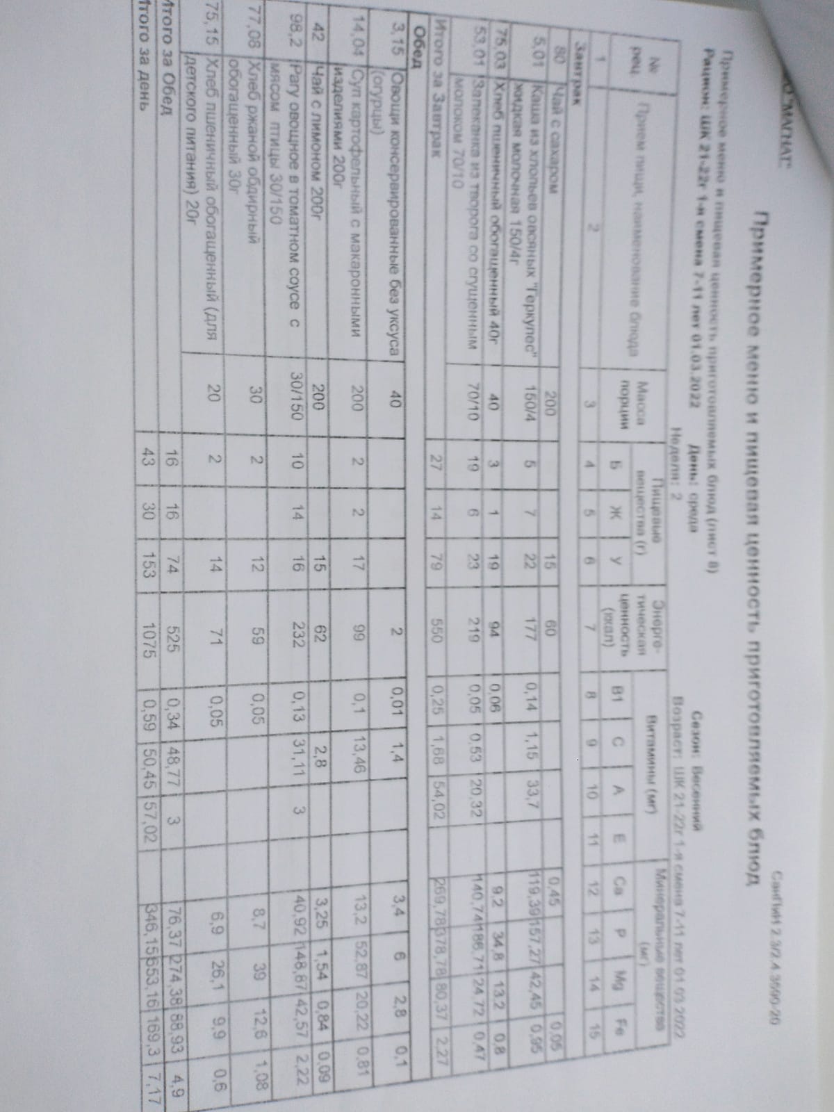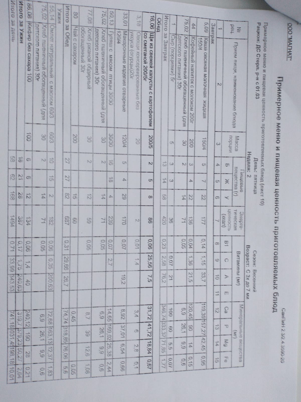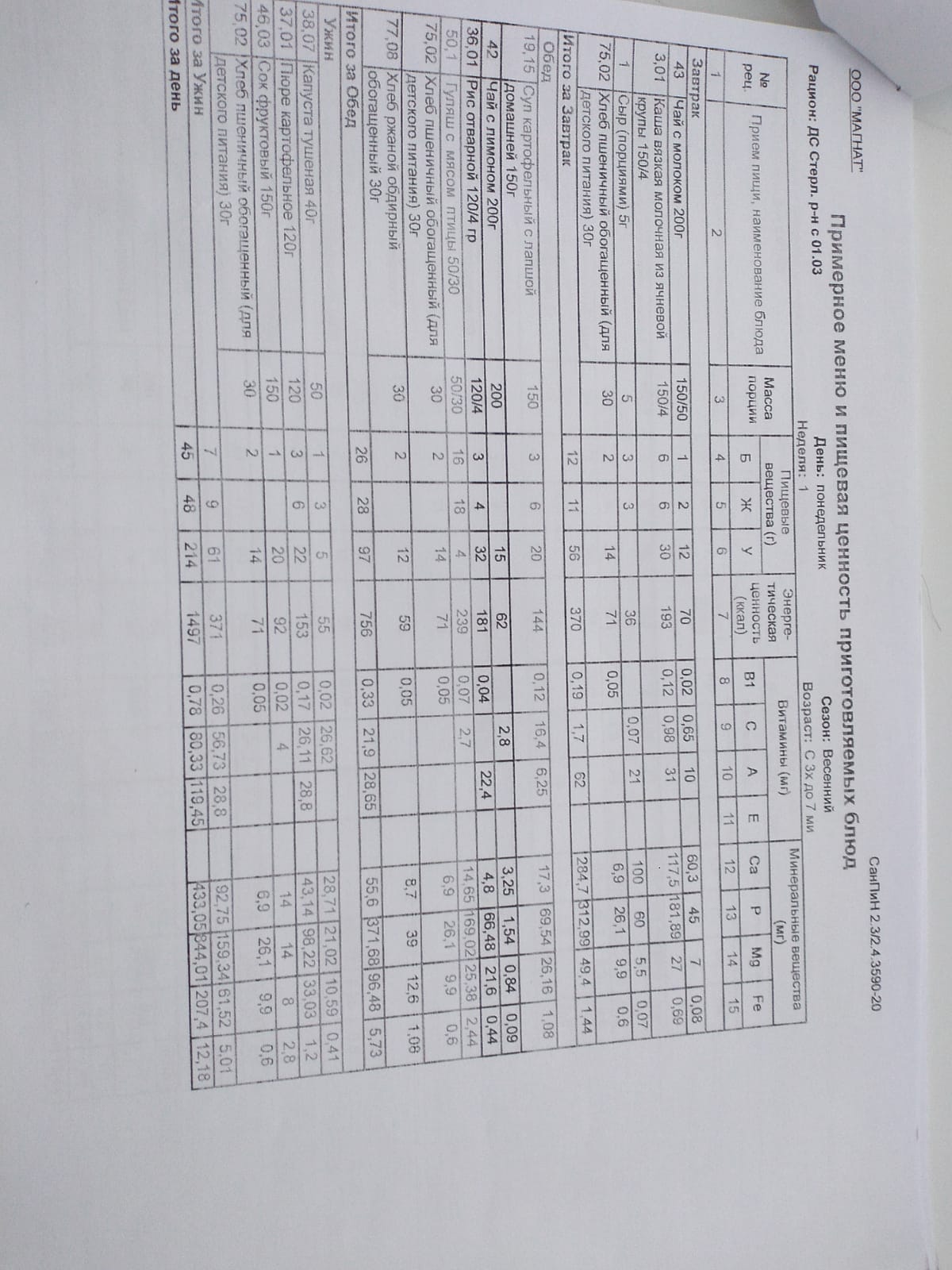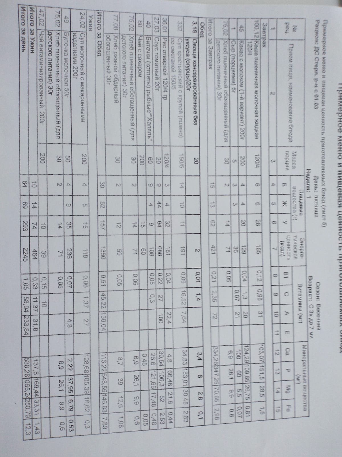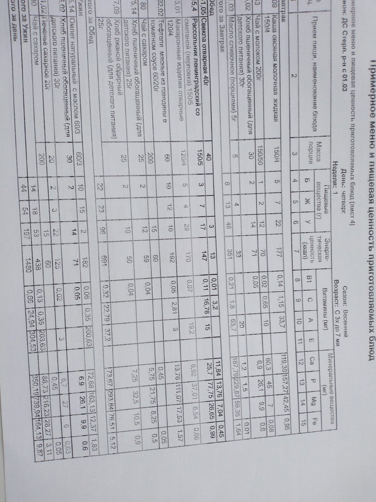 Ежедневное меню дошкольной группы филиал д.Преображеновка
