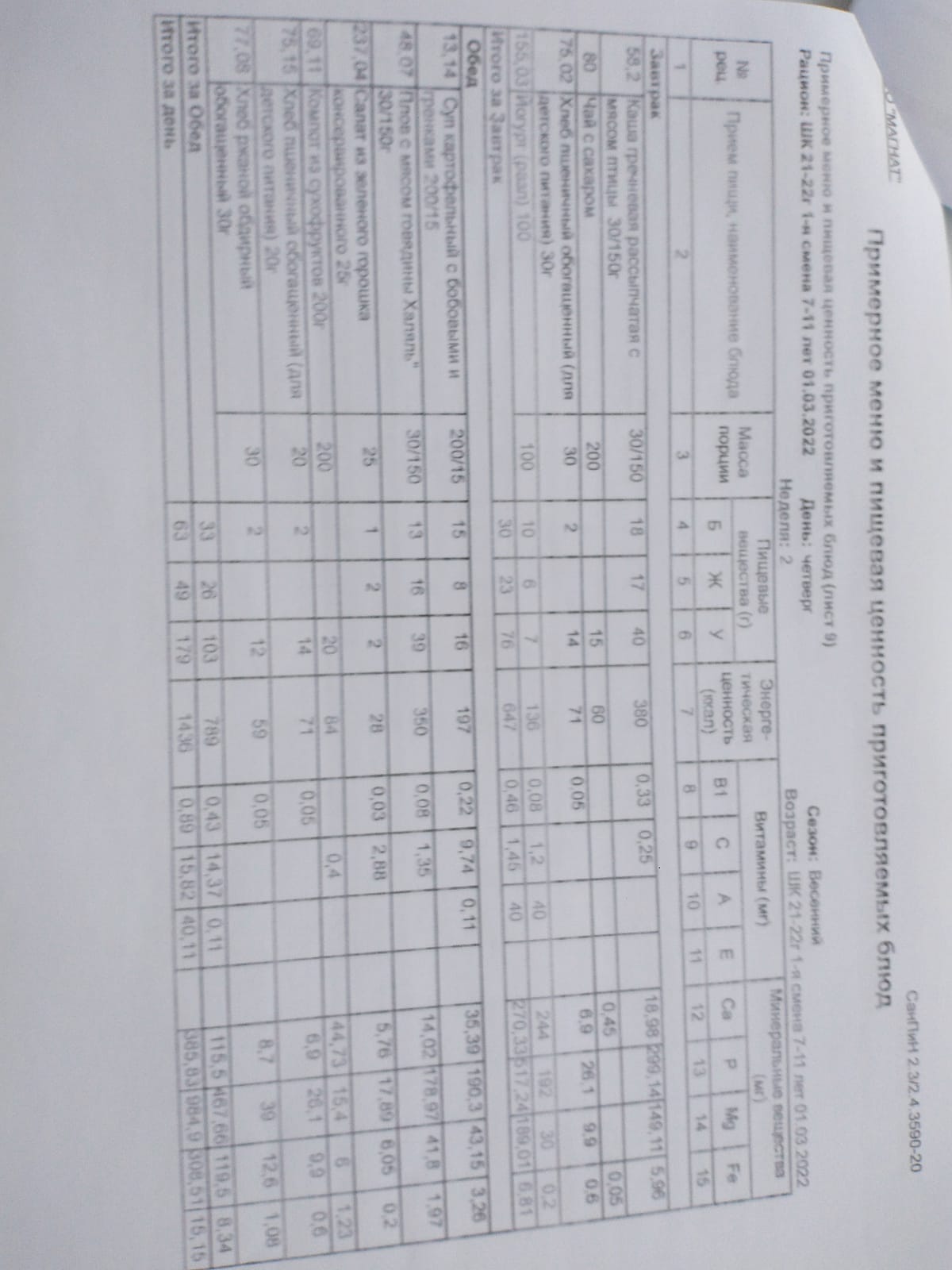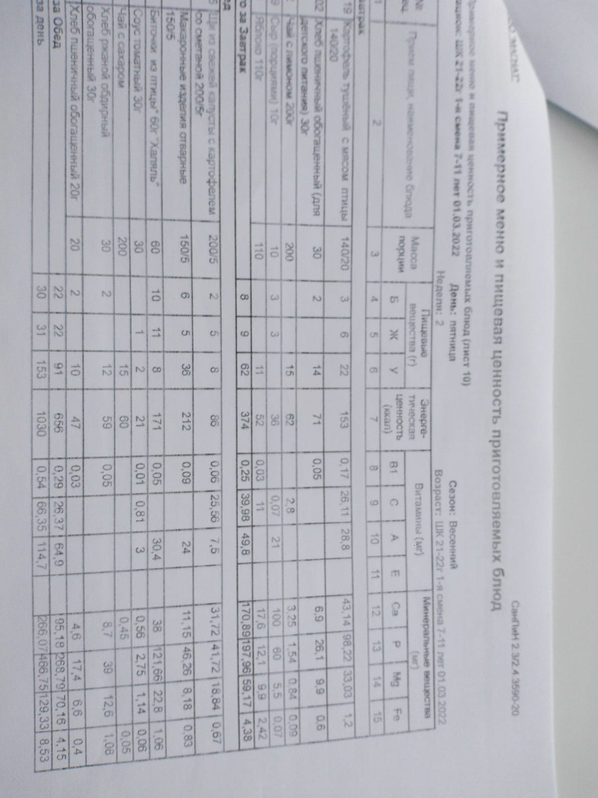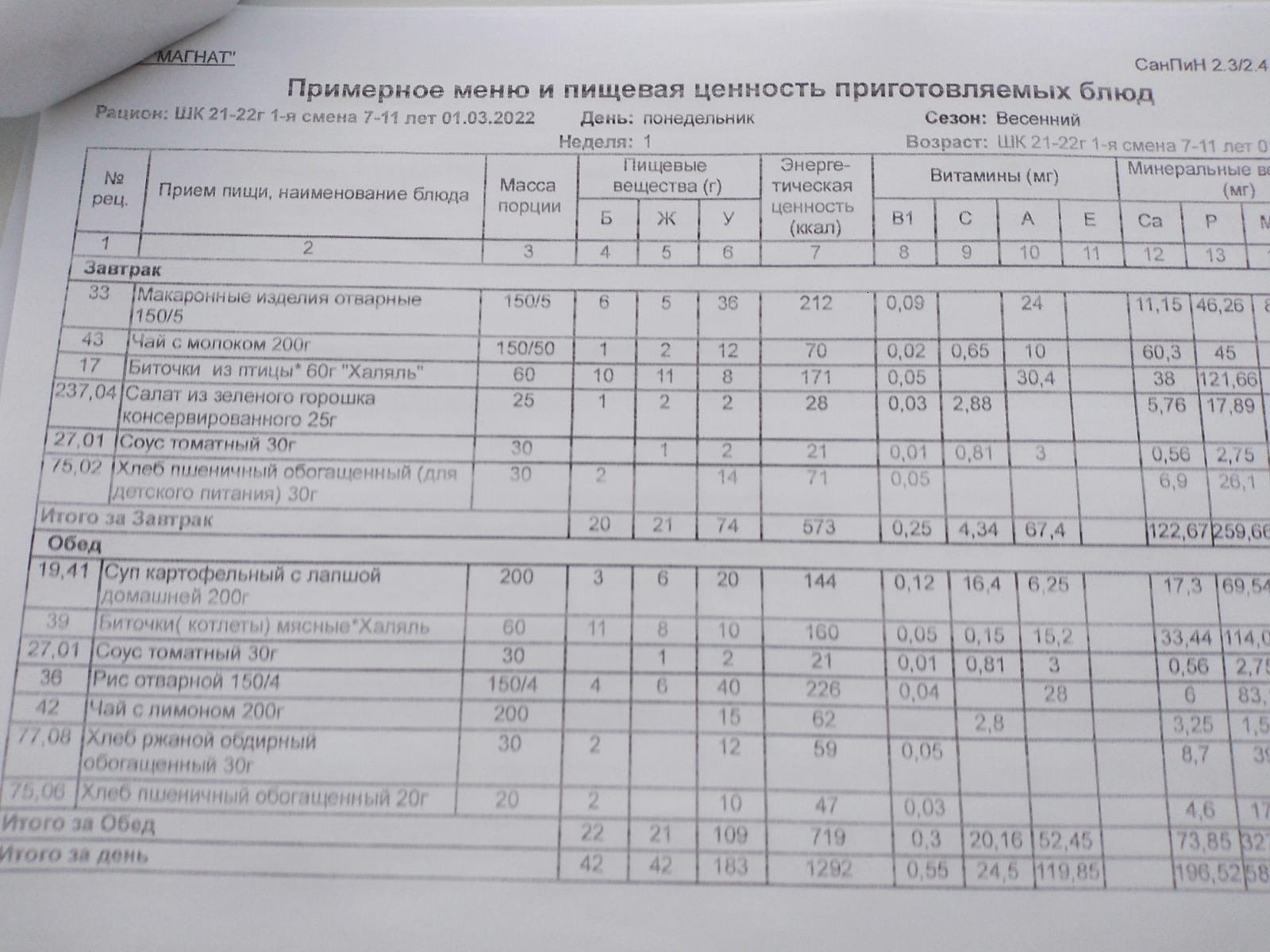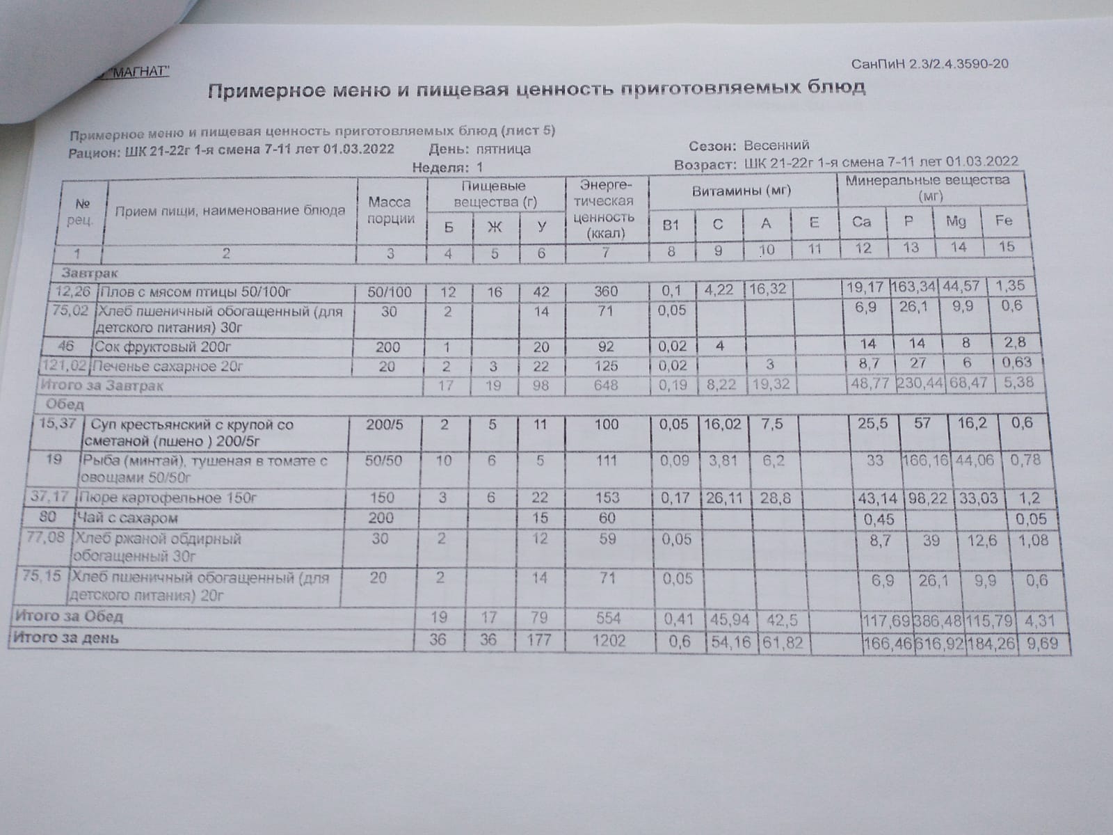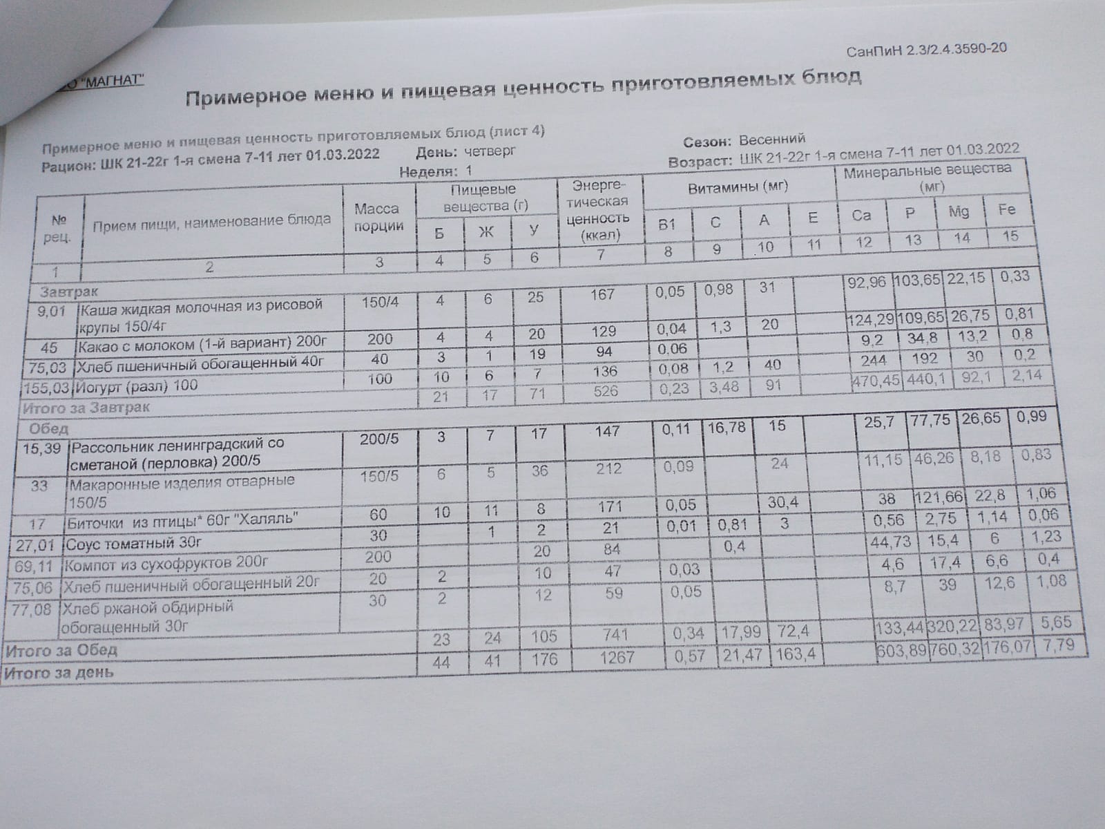 Ежедневное меню дошкольной группы филиал д.Преображеновка