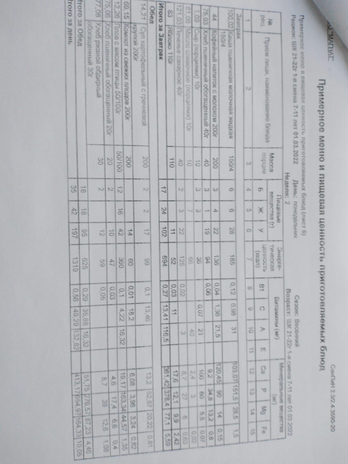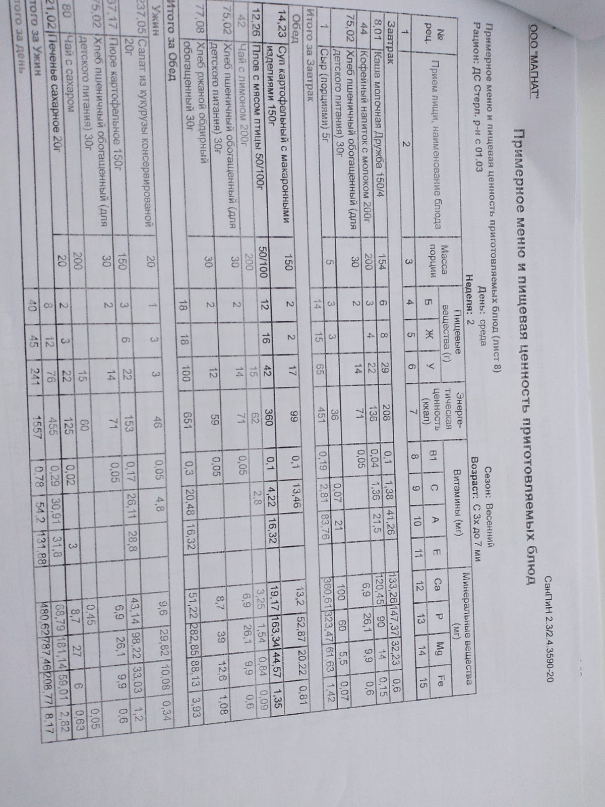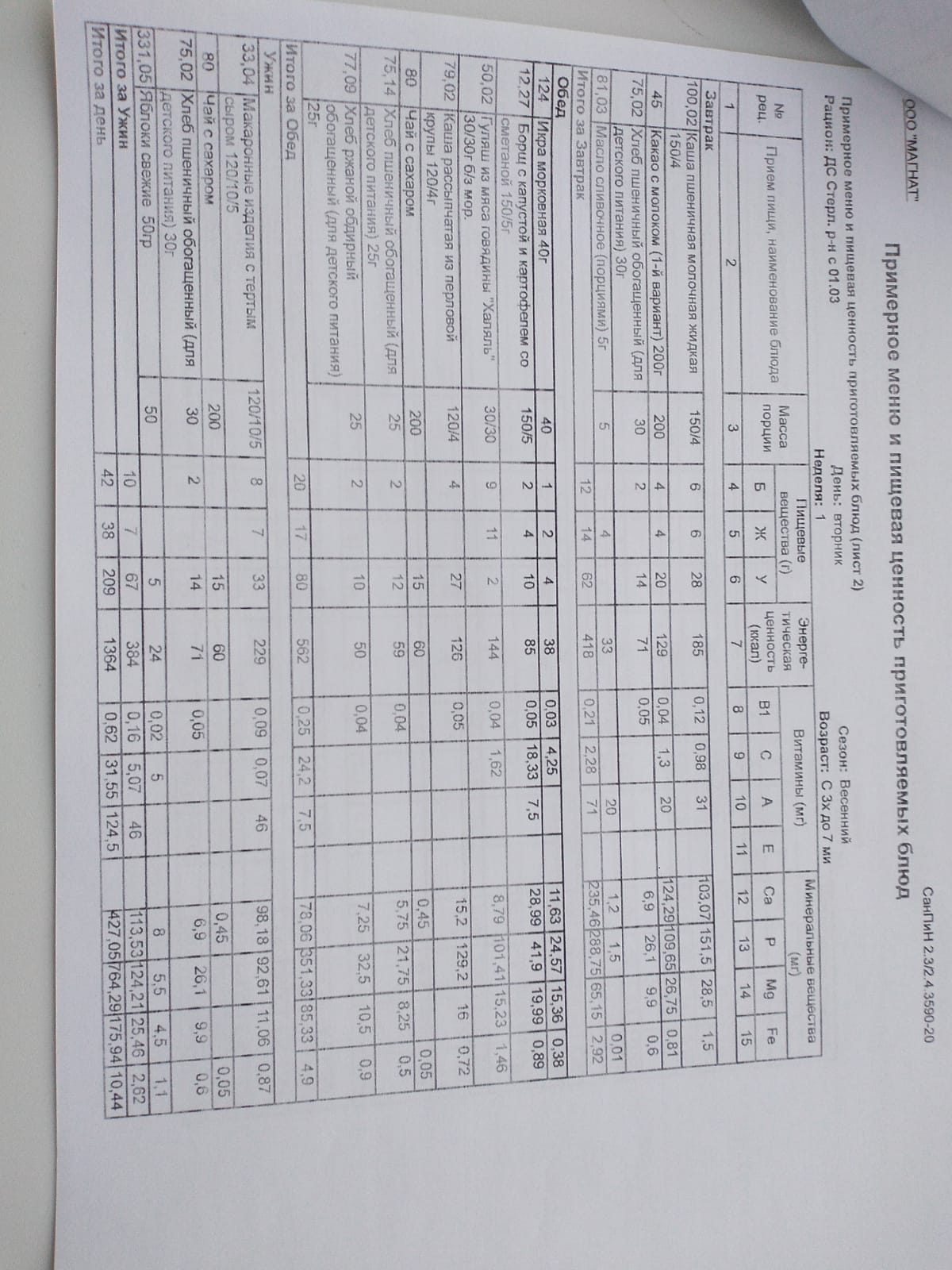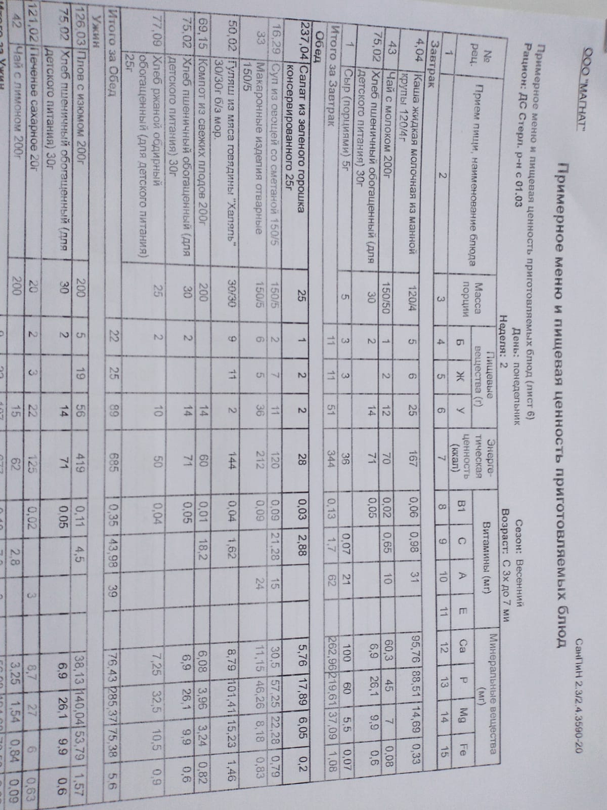 Ежедневное меню дошкольной группы филиал д.Преображеновка