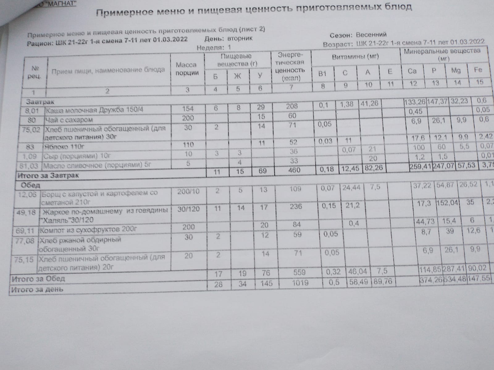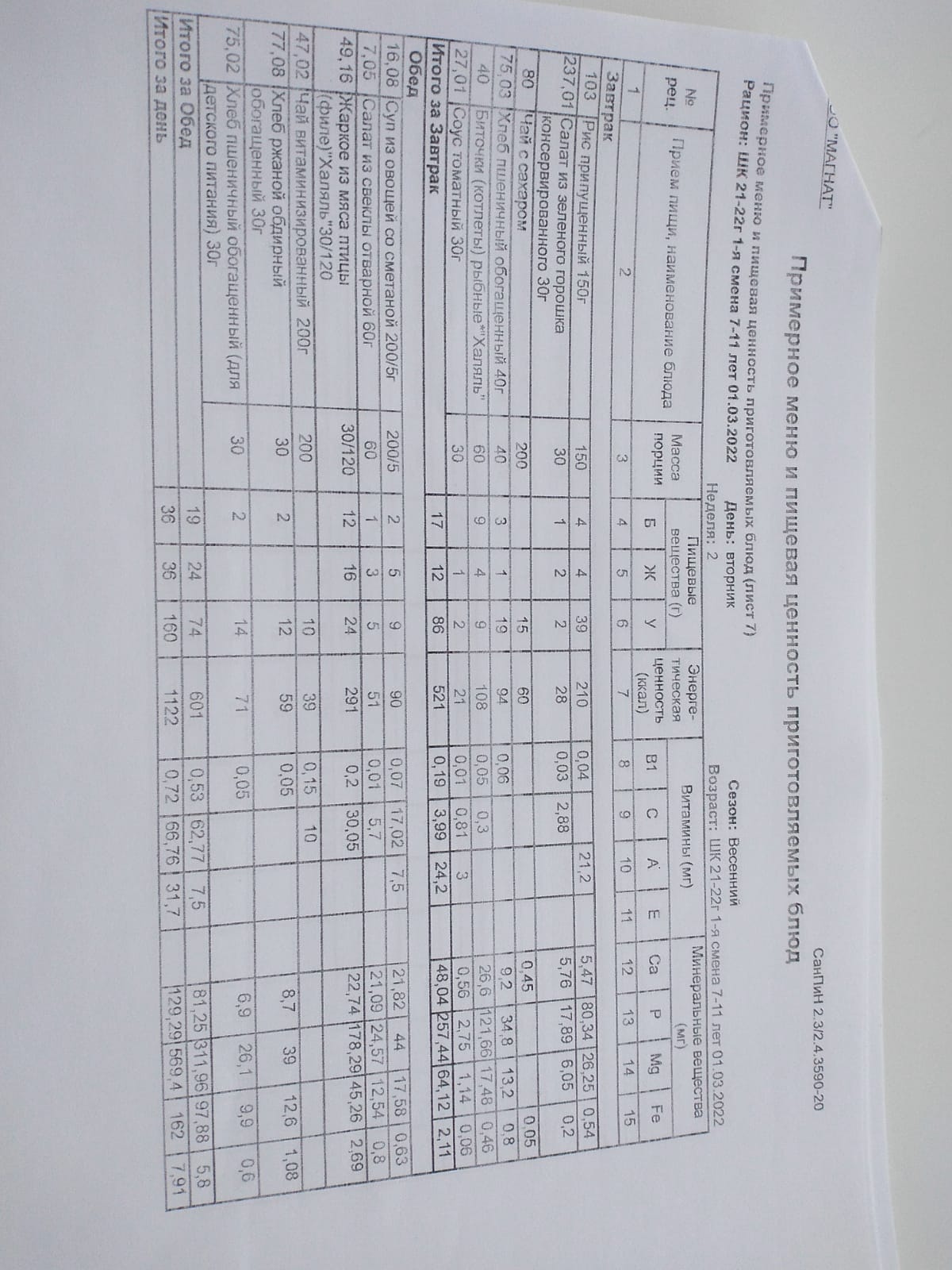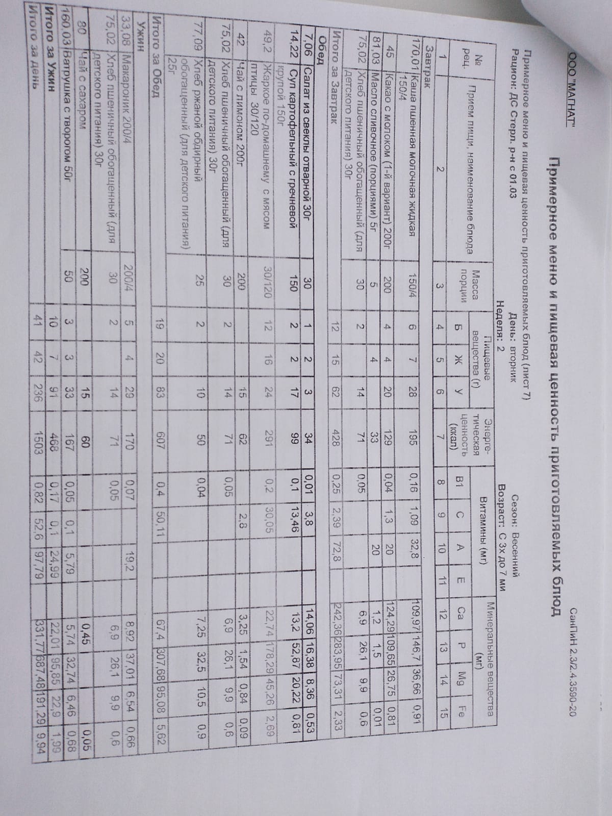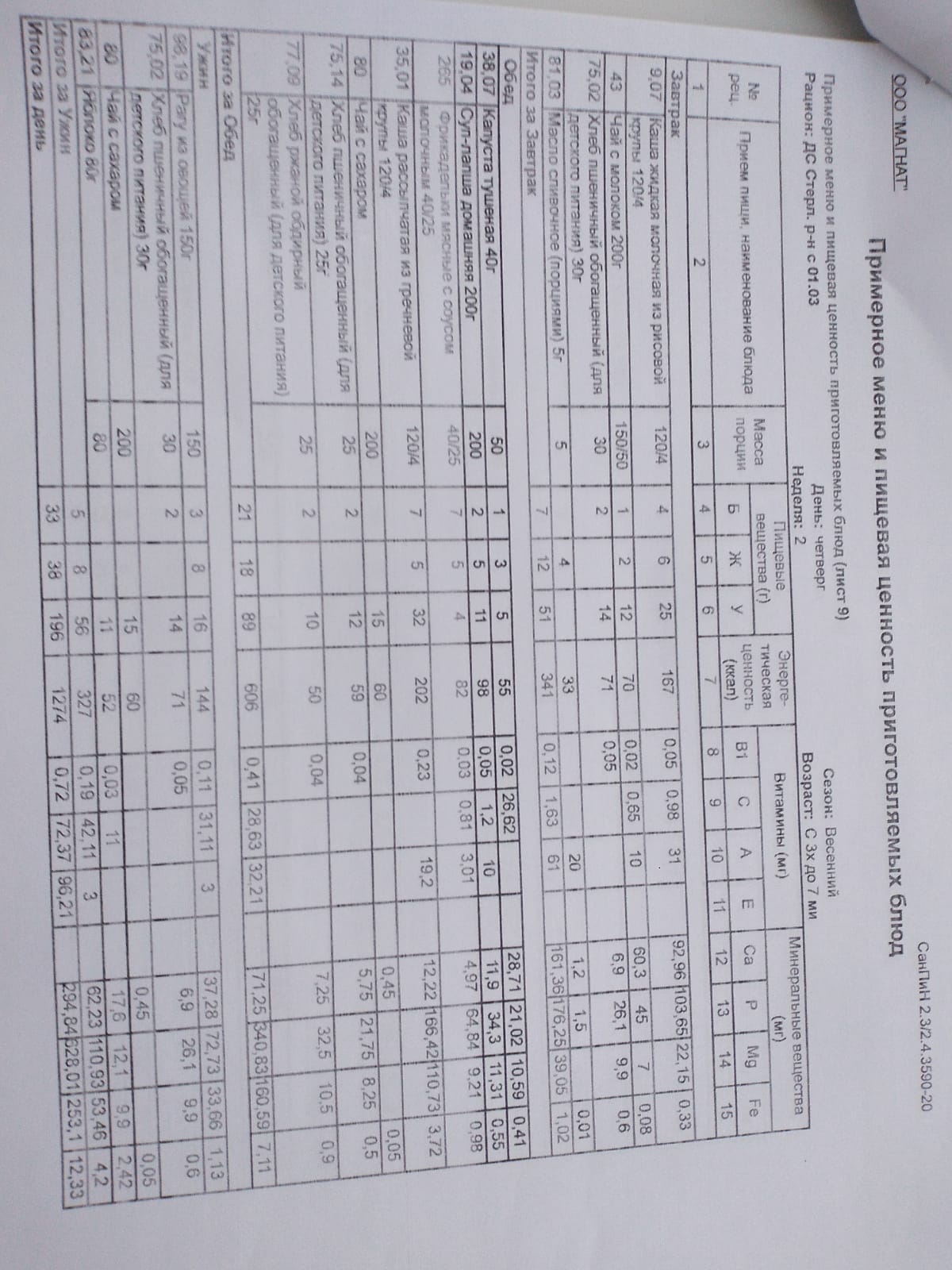 Ежедневное меню дошкольной группы филиал д.Преображеновка