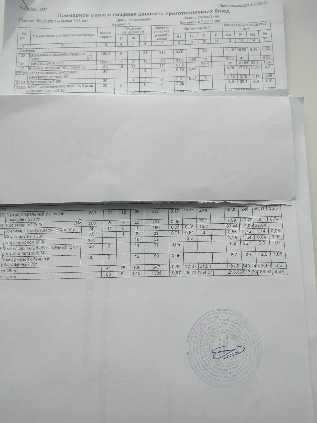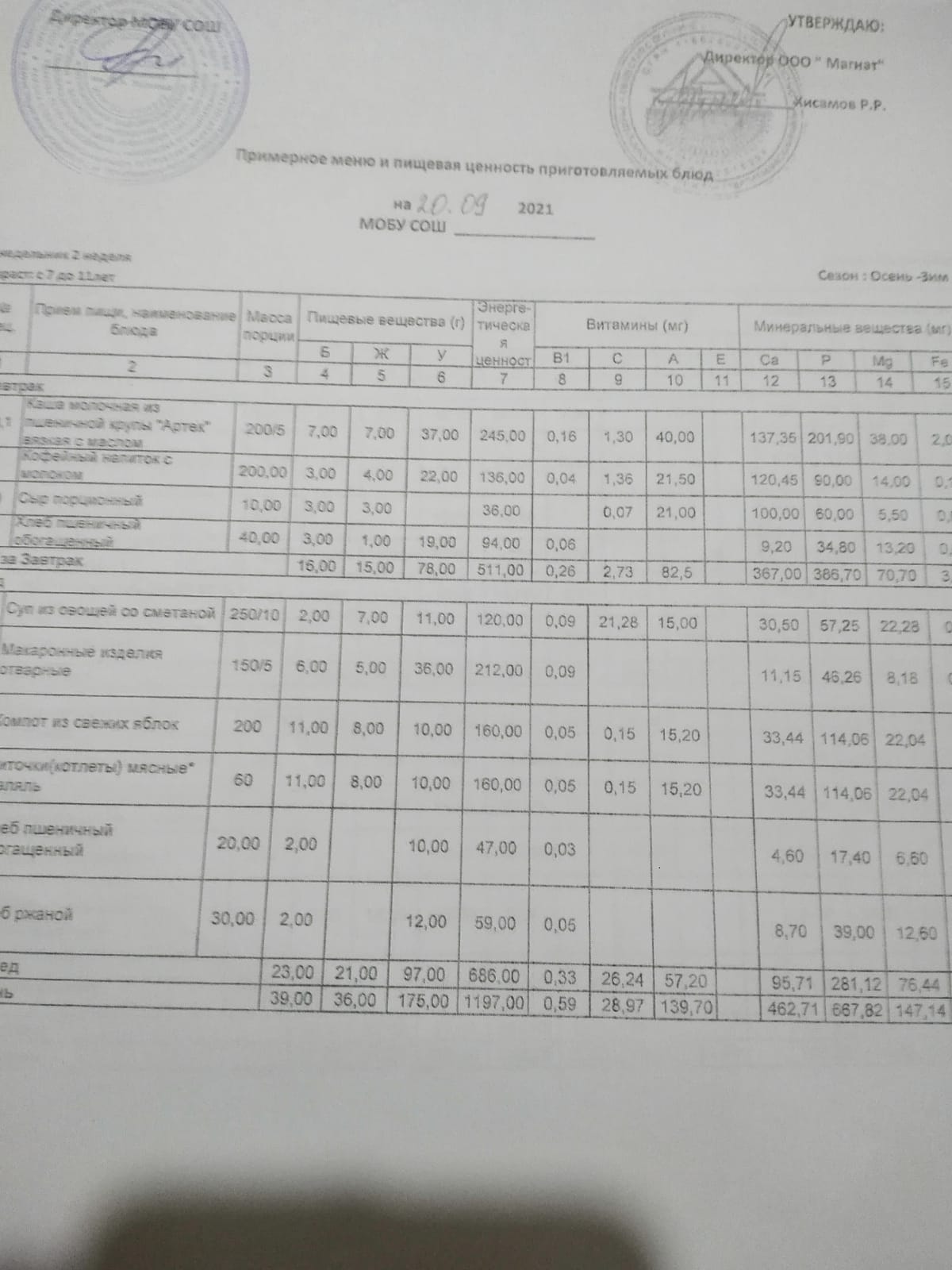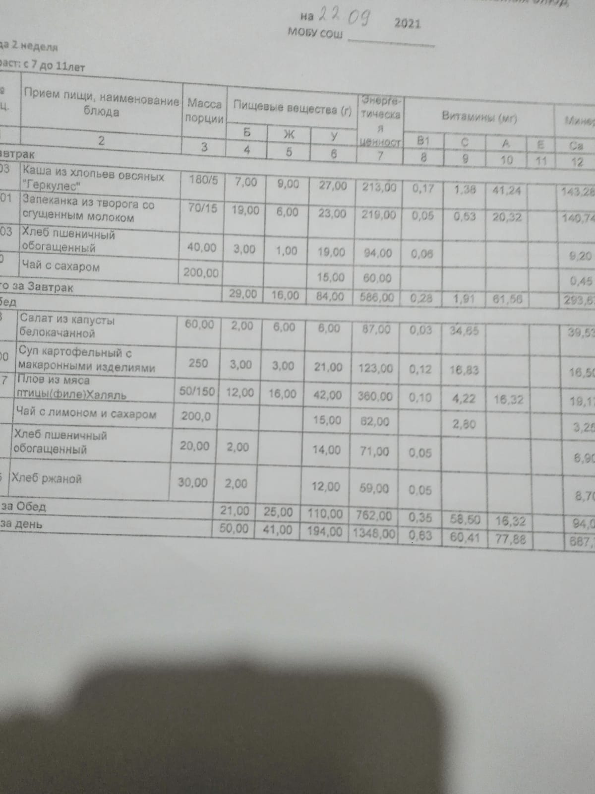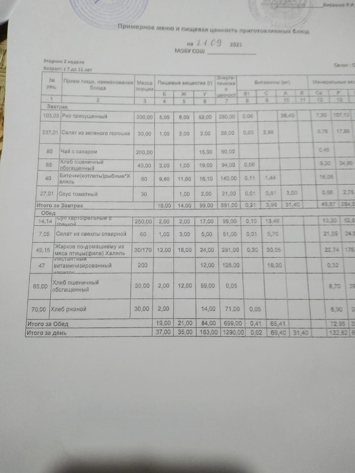 Ежедневное меню дошкольной группы филиал д.Преображеновка